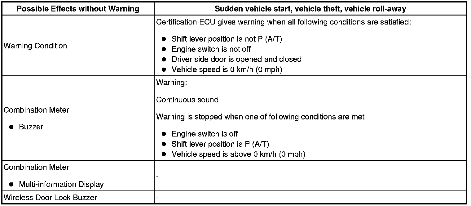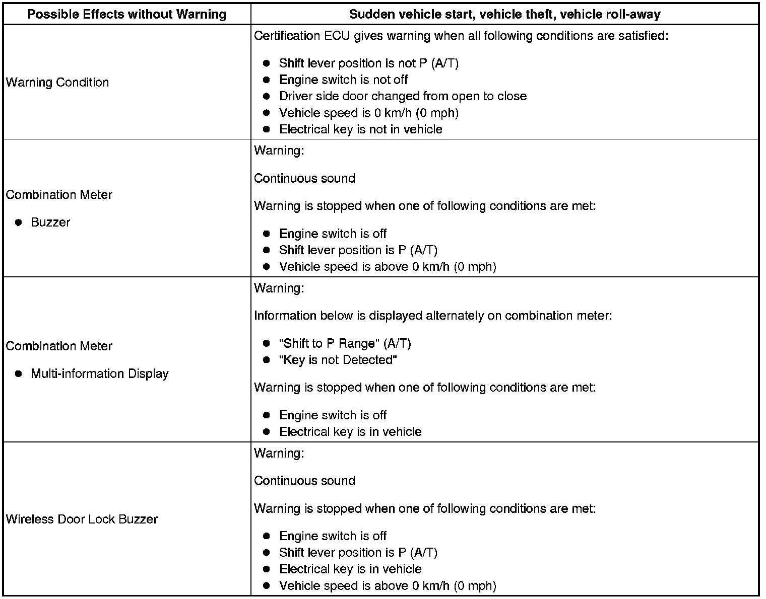 When any of the situations below occur, the smart access system with push-button start causes the certification ECU to sound the buzzer in the combination meter and the wireless door lock buzzer, and illuminate the combination meter's multi-information display in order to alert the driver.