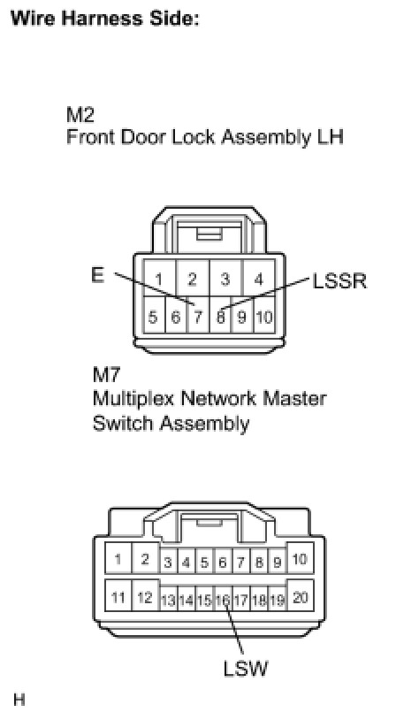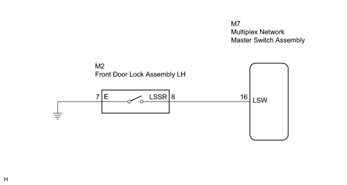 The multiplex network master switch assembly is connected to the driver's door lock assembly via terminal LSW and driver's door lock/unlock state signals are input to the multiplex network master switch assembly.