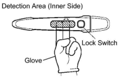 HINT: Due to the electrical key being unable to communicate with the system within a 0.2 m (0.6 ft) distance from the outside handle, do not press the lock switch with the same hand that is holding the electrical key. The doors will not lock.
