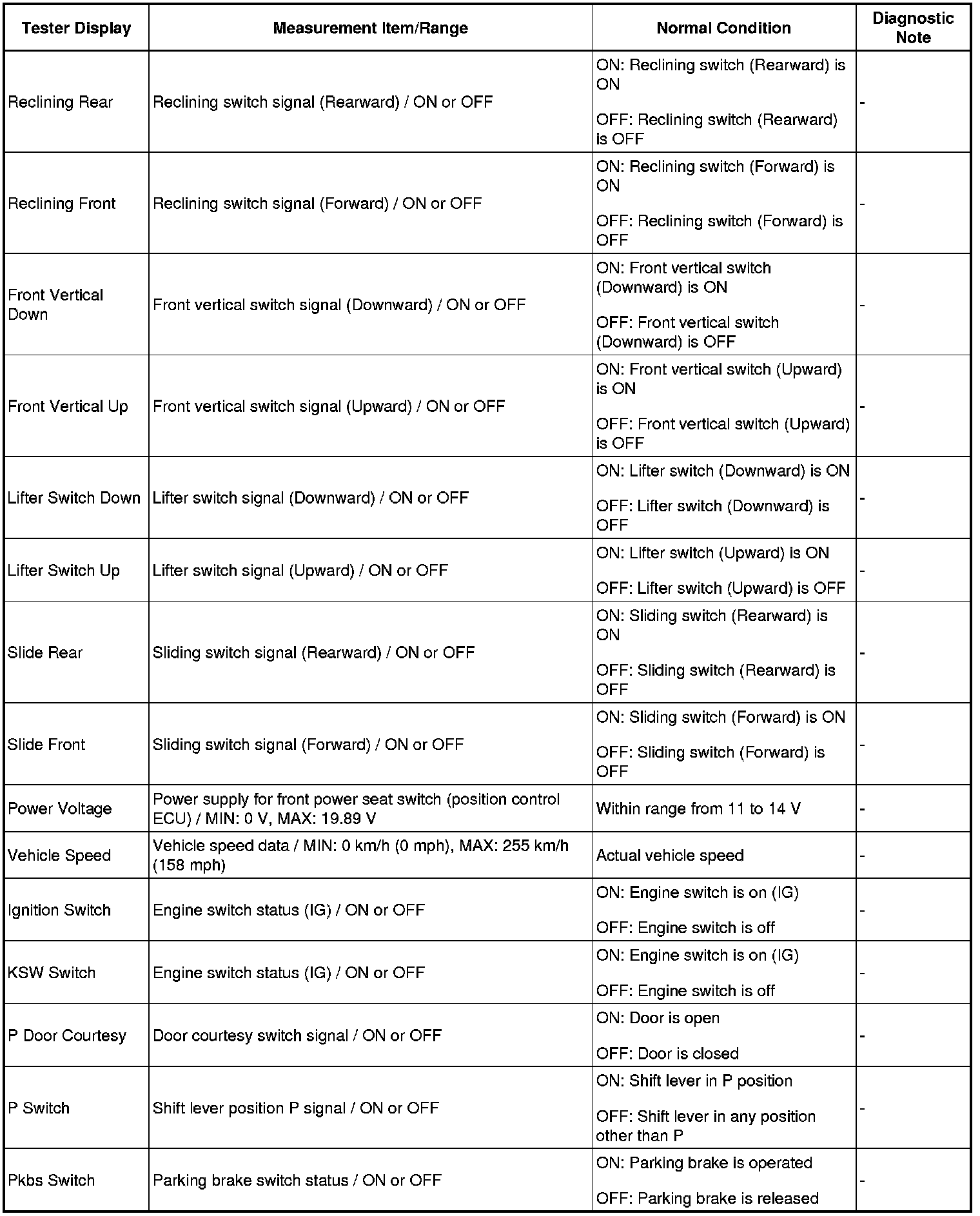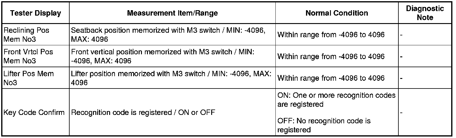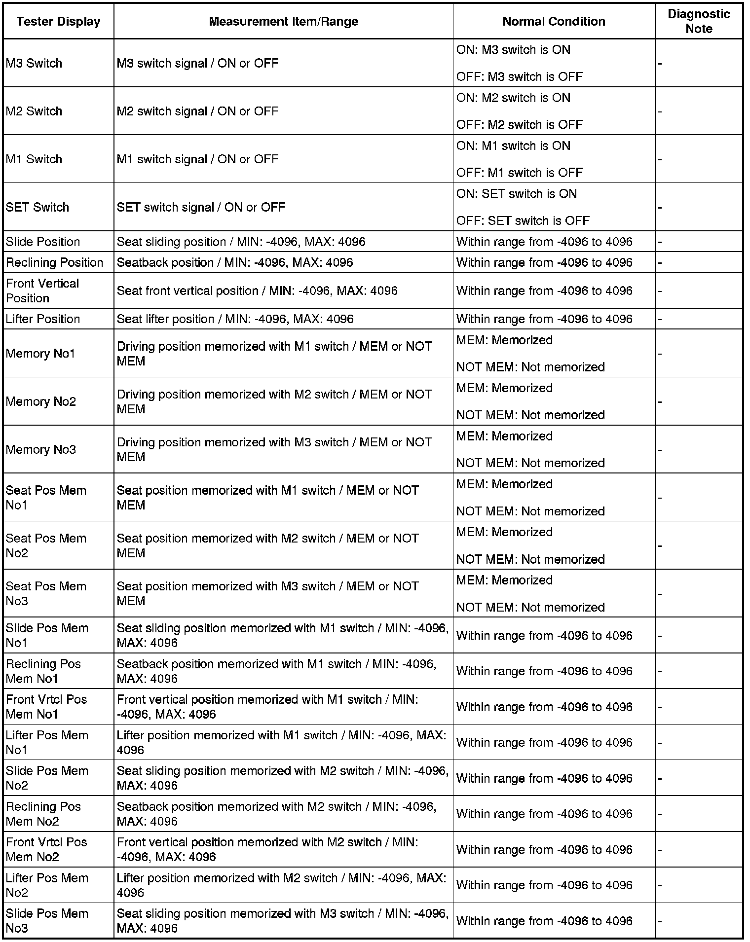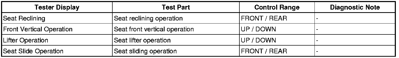 SEAT: FRONT POWER SEAT CONTROL SYSTEM (w/ Seat Position Memory System): DATA LIST / ACTIVE TEST