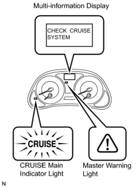 (a) The diagnosis function makes the master warning light and the multi-information display come on, and the CRUISE main indicator light blinks as shown in the illustration. When a malfunction occurs in the dynamic radar cruise control system, the DTCs are stored in the ECM.