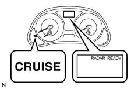 (b) Check that the CRUISE main indicator light and RADAR READY indicator come on when the main switch ON-OFF button is pushed on, and that the indicator light and the indicator go off when the ON-OFF button is pushed off.