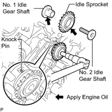 (b) Temporarily install the No. 1 idle gear shaft and idle sprocket with the No. 2 idle gear shaft while aligning the knock pin of the No. 1 idle gear with the knock pin groove of the cylinder block.