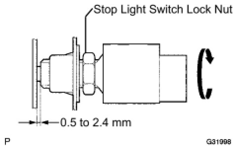 (b) Turn the stop light switch assembly so that the clearance between the threaded area of the switch and the area where the pedal makes contact is between 0.5 and 2.4 mm (0.020 to 0.095 in. ). Fully tighten the lock nut.