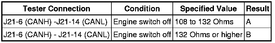 There may be an open circuit in the CAN main bus line and/or the DLC3 branch line when the resistance between terminals 6 (CANH) and 14 (CANL) of the DLC3 is 69 Ohms or more.