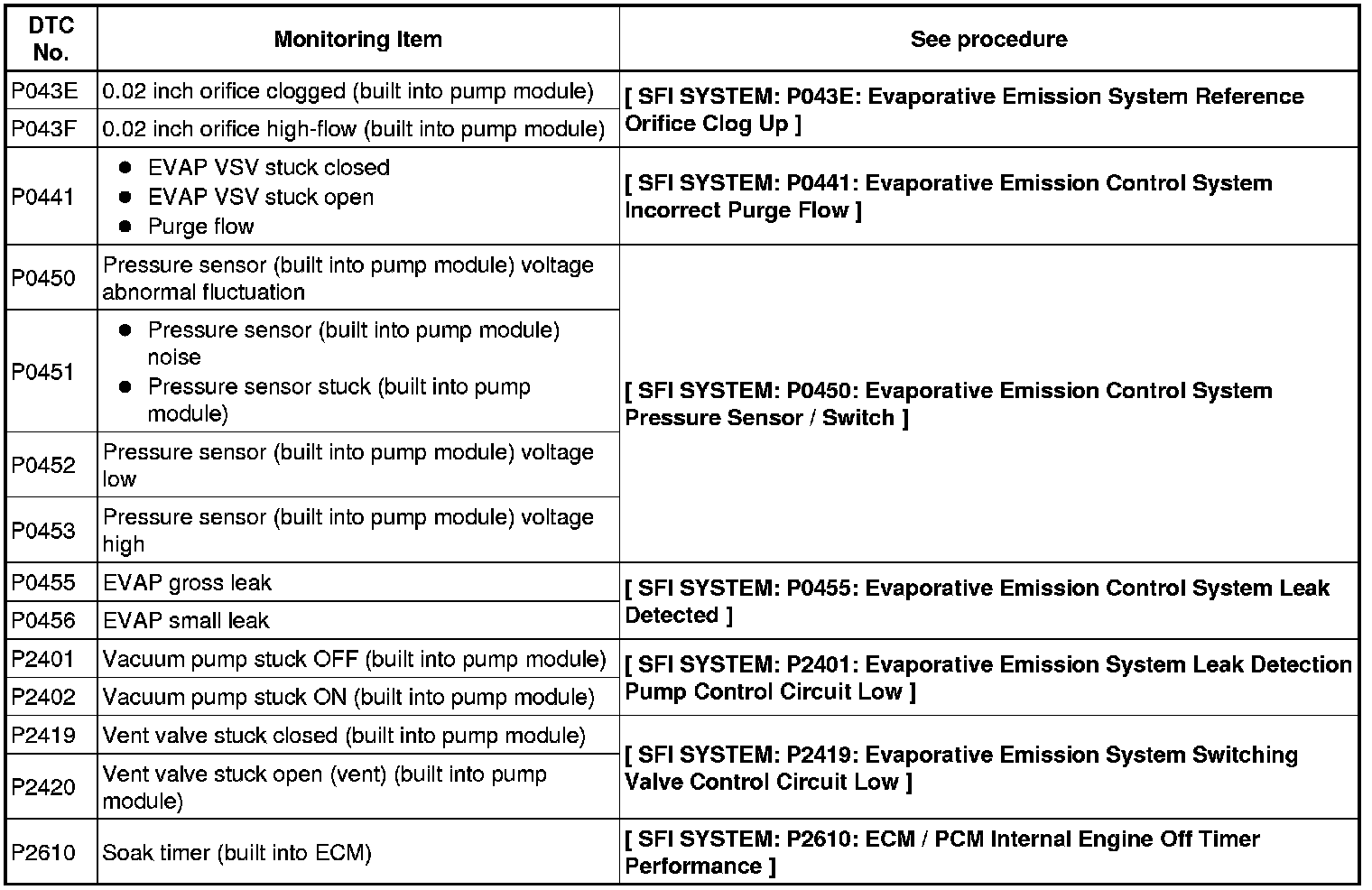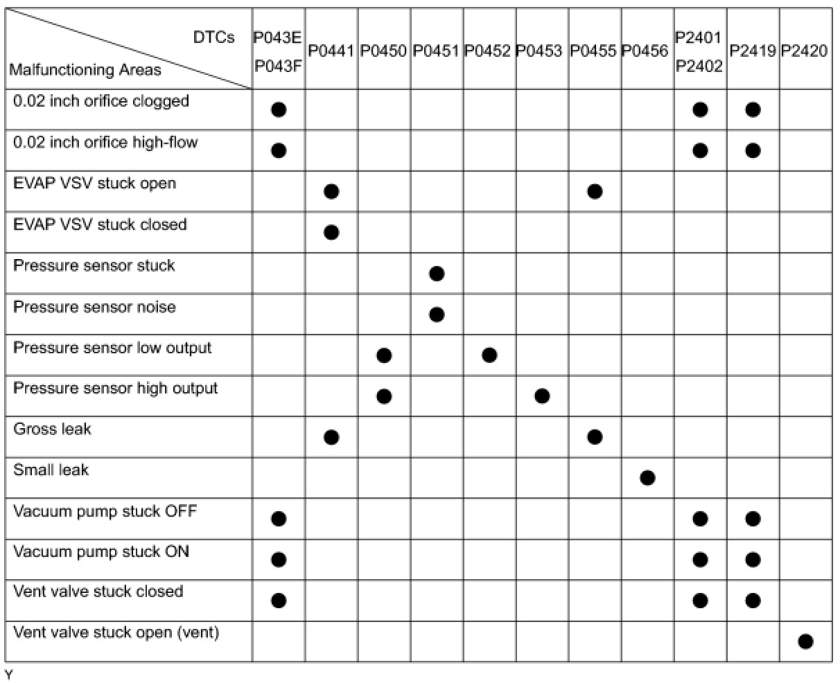 If any EVAP system DTCs are set, the malfunctioning area can be determined using the table below.