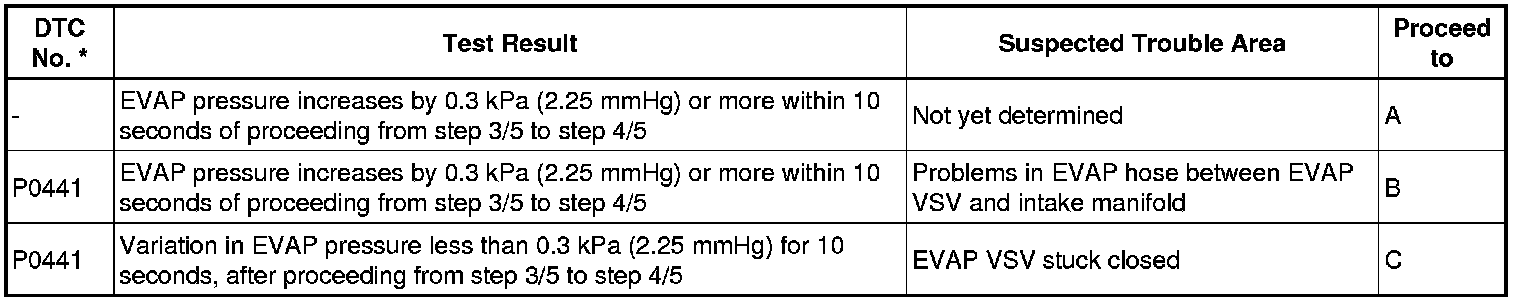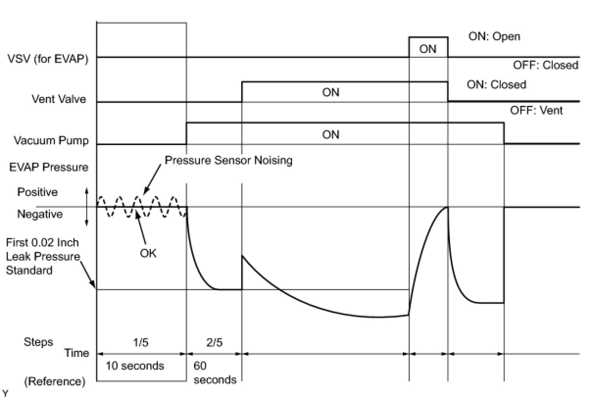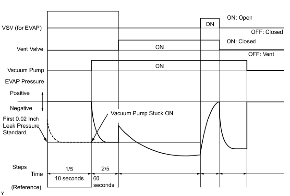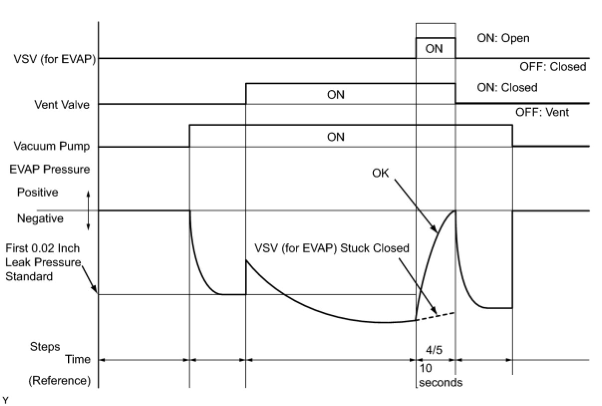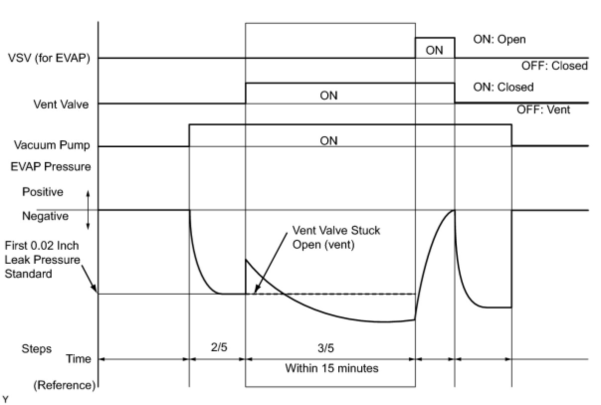 The vent valve turned OFF (open) and the EVAP pressure is then measured. If the variation in the pressure is less than 0.5 kPa (3.75 mmHg), the ECM interprets this as the EVAP VSV being stuck closed, and illuminates the MIL and sets DTC P0441 (2 trip detection logic).