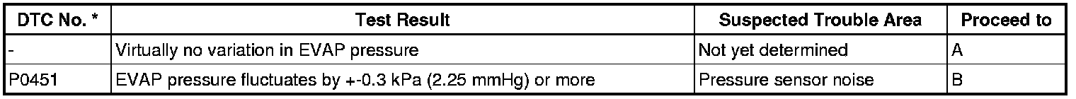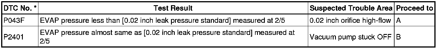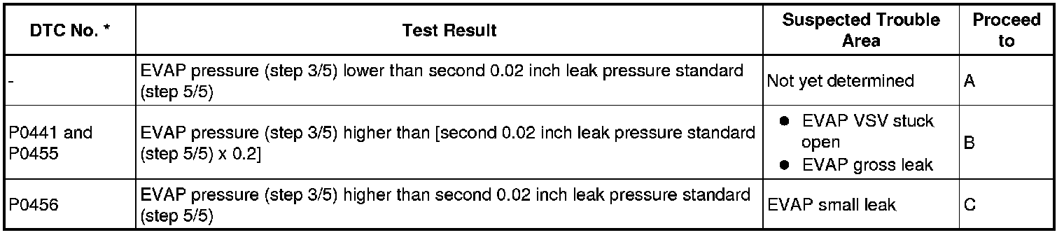 NOTE: If the 0.02 inch reference pressure difference between the first and second checks is greater than the specification, the DTCs corresponding to the reference pressure (P043E, P043F, P0441, P0455, P0456, P2401 and P2420) will all be stored.