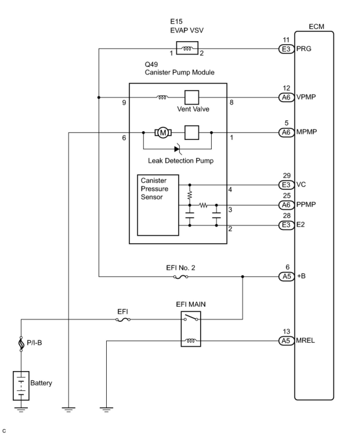 The electric vacuum pump creates negative pressure (vacuum) in the EVAP system and the pressure is measured. Finally, the ECM monitors for leaks from the EVAP system and malfunctions in both the pump module and EVAP VSV, based on the EVAP pressure.