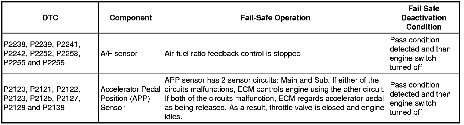 If any of the following DTCs are set, the ECM enters fail-safe mode to allow the vehicle to be driven temporarily.