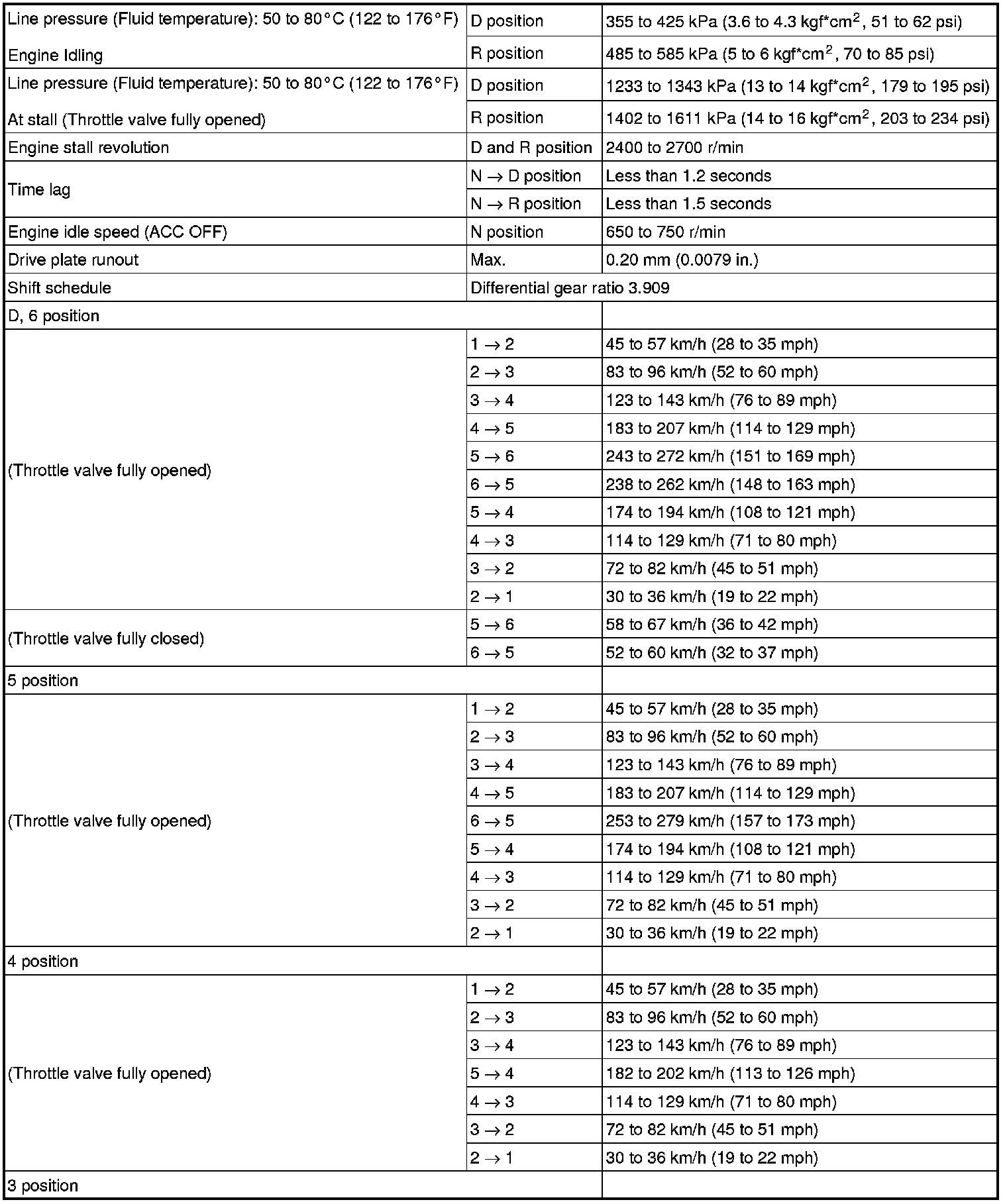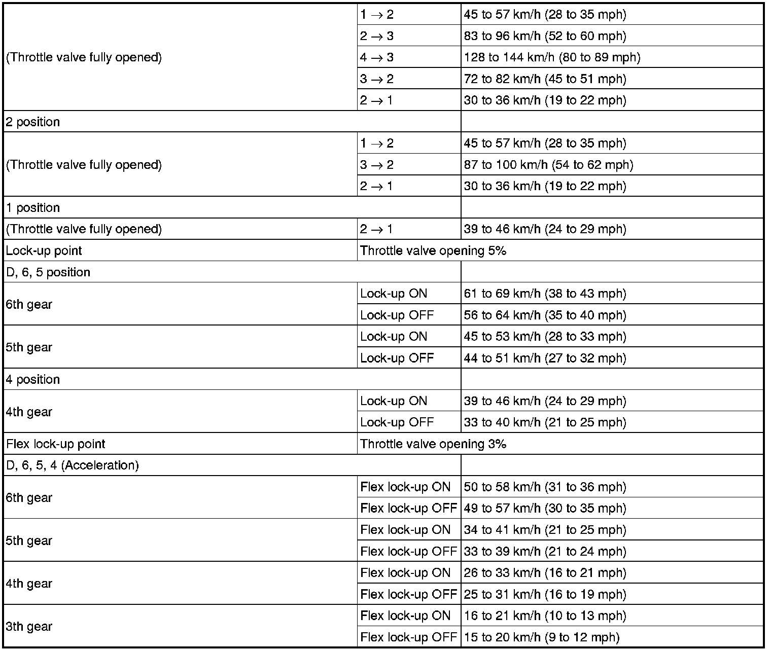 - All shift point values indicated in the above tables are actual values. Therefore, if checking a shift point with a chassis dynamometer, keep in mind that there is a range of error in the chassis dynamometer indication.