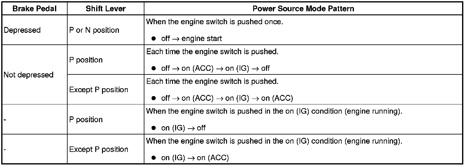 (h) After the buzzer sounds, if the engine switch is pressed within 5 seconds with the brake pedal not depressed (A/T) or clutch pedal not depressed (M/T), the power source mode changes to on (ACC) or on (IG), the same as in the normal condition.