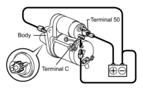 (1) Disconnect the negative (-) terminal lead from terminal C under condition pull-in test. Check that the pinion gear remains out.
