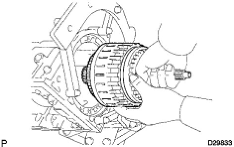(d) Hold the input shaft, and lightly press the oil pump body to slide the oil seal rings into the overdrive direct clutch drum.