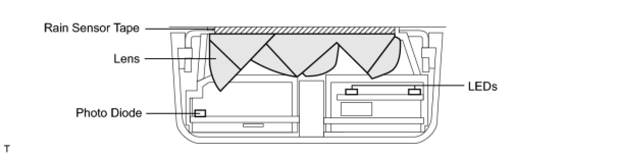 (1) The rain sensor consists of 2 LEDs (Light Emitting Diodes) that emit infrared rays, a photo diode that can receive those rays, a lens, and rain sensor tape.