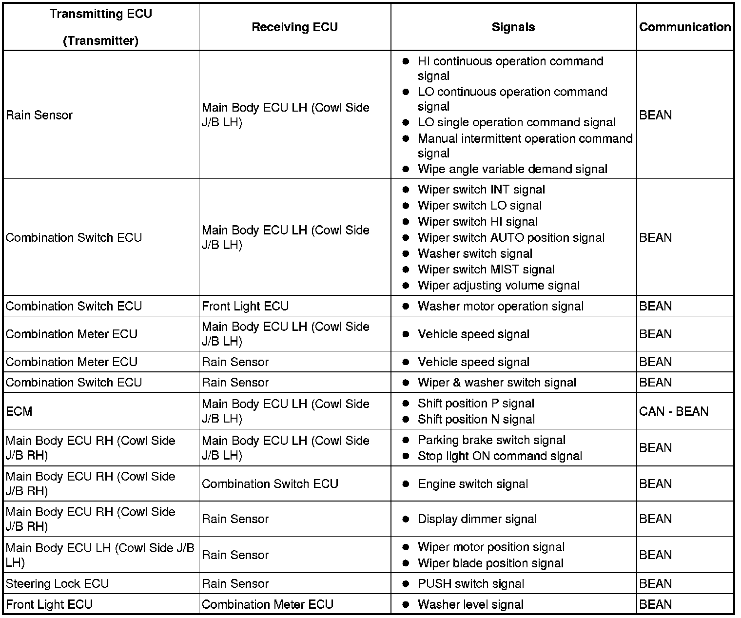 - The main body ECU LH adjusts the wiper timing based on commands from the rain sensor. These adjustments are based on vehicle speed and a determination of the vehicle driving and stopping conditions during automatic operation.