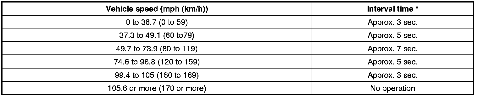 (2) As shown in the following chart, after the end of this operation, the wiper operates once more. It does so after an interval time (between 3 to 7 seconds) determined based on the vehicle speed so that any washer fluid drips are wiped away. The speed signal used for this function is sent by the combination meter, and received by the main body ECU LH.