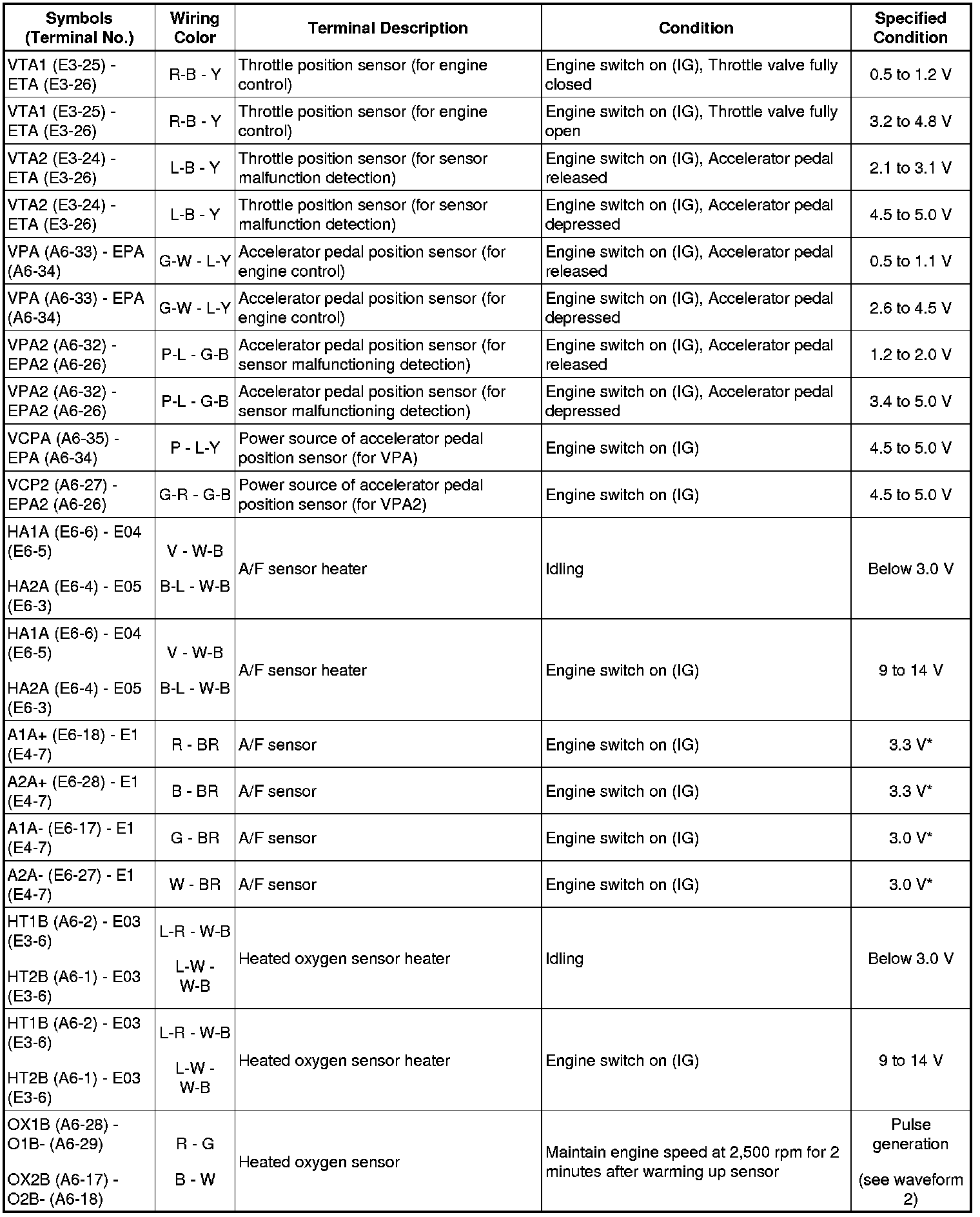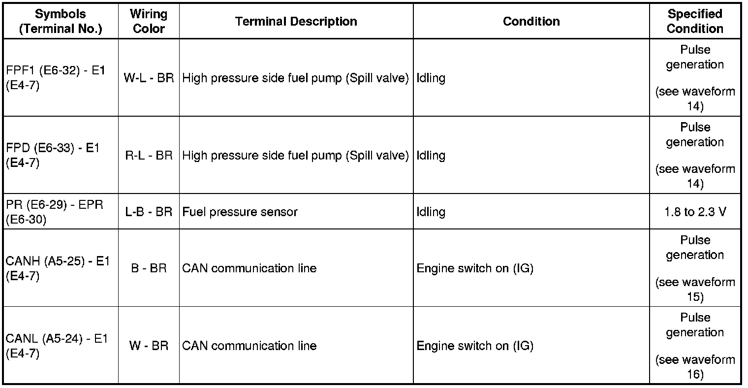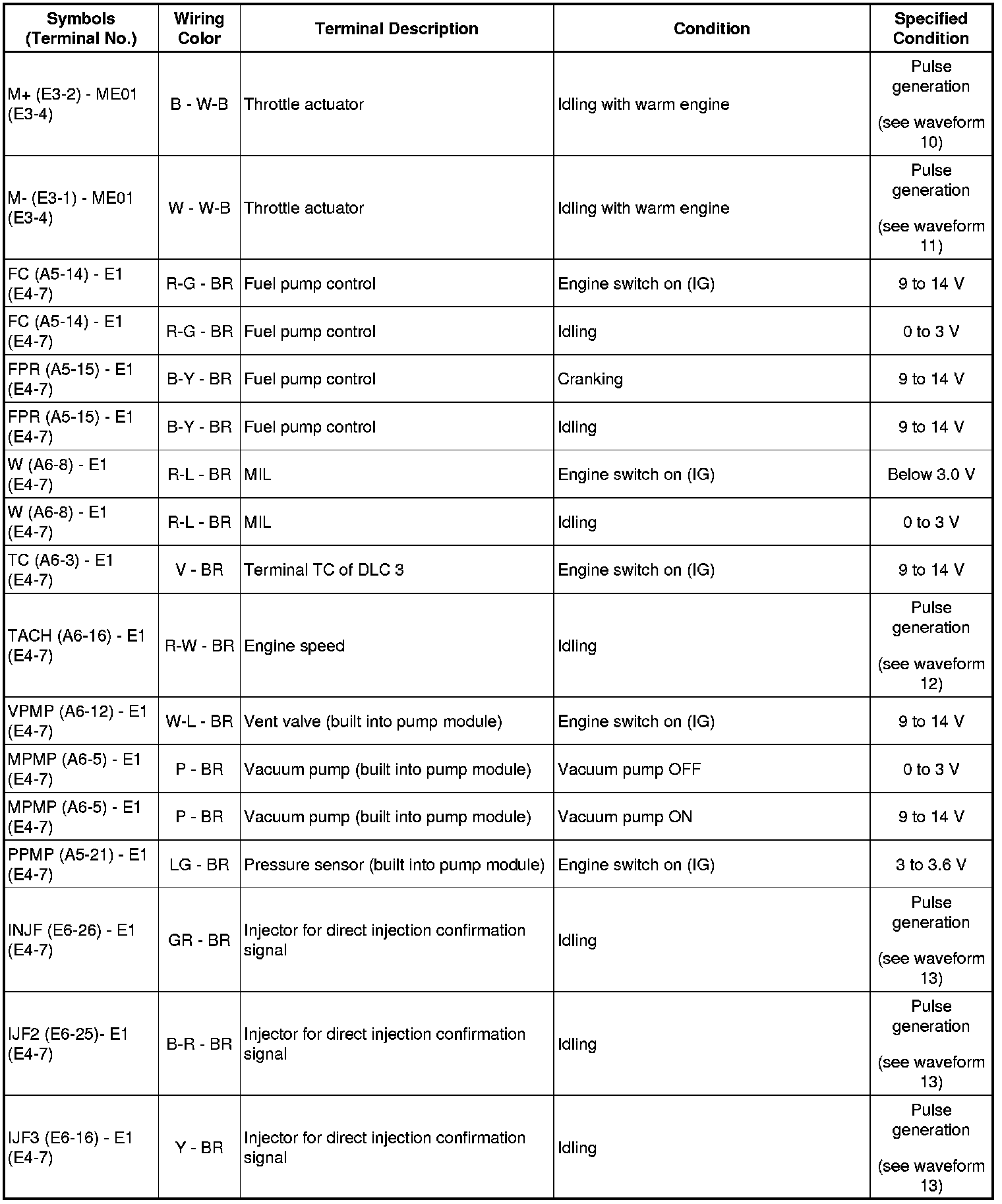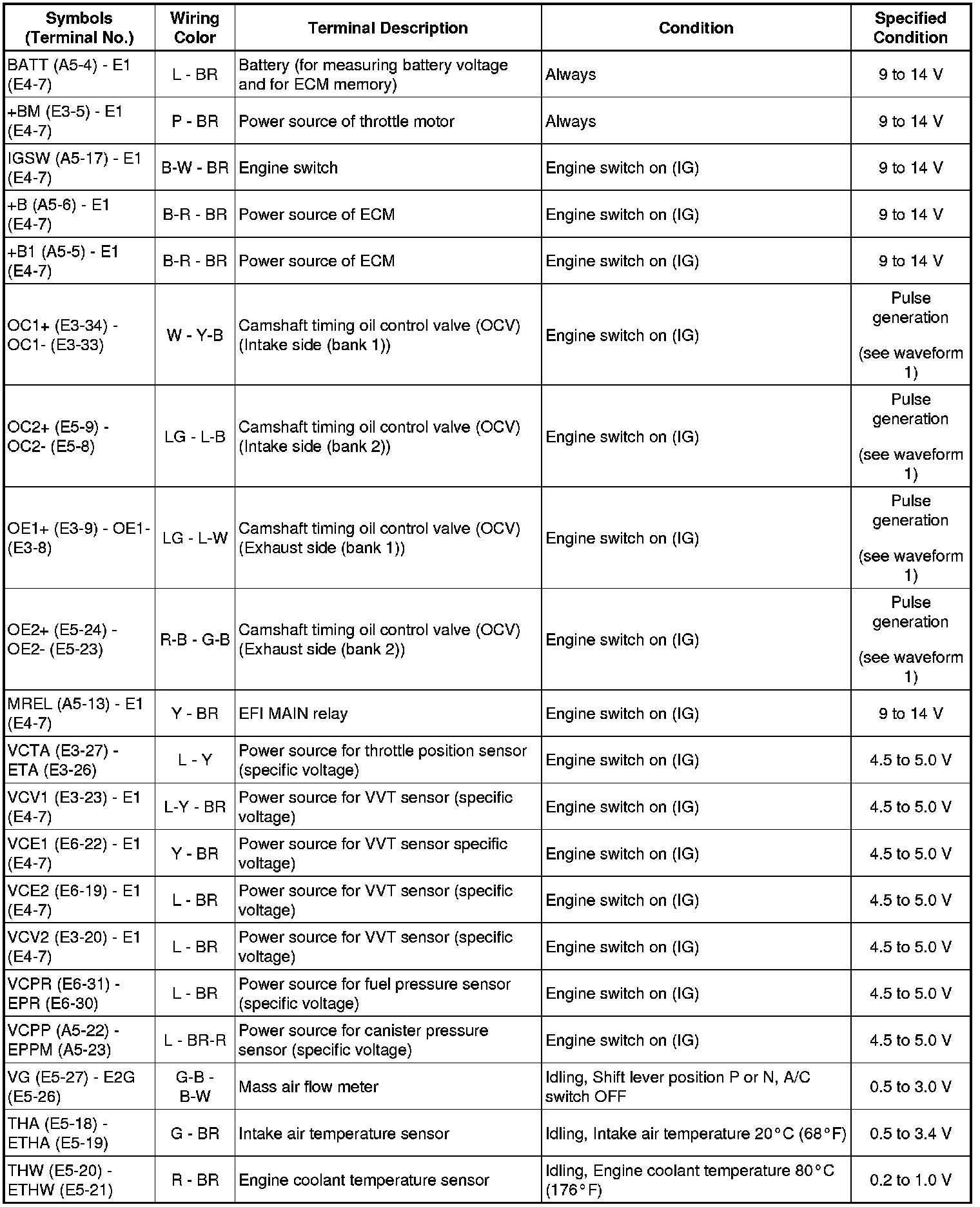 HINT: The standard normal voltage between each pair of the ECM terminals is shown in the table below. The appropriate conditions for checking each pair of the terminals are also indicated. The result of checks should be compared with the standard normal voltage for that pair of terminals, displayed in the Specified Condition column. The illustration above can be used as a reference to identify the ECM terminal locations.