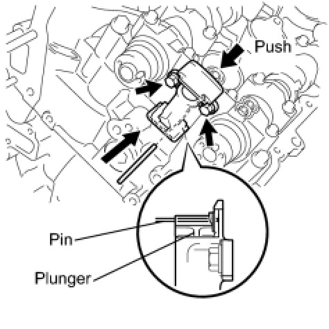 (b) While raising the No. 2 chain tensioner assembly, insert a 1.0 mm (0.0394 in.) pin into the hole to fix it in place.