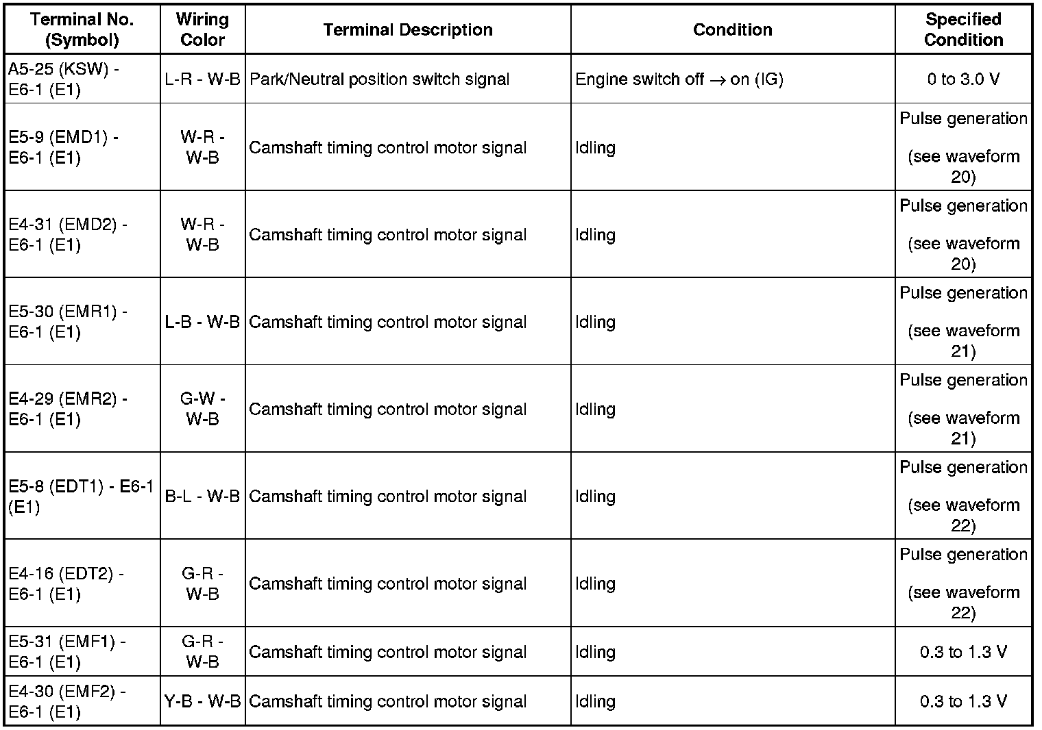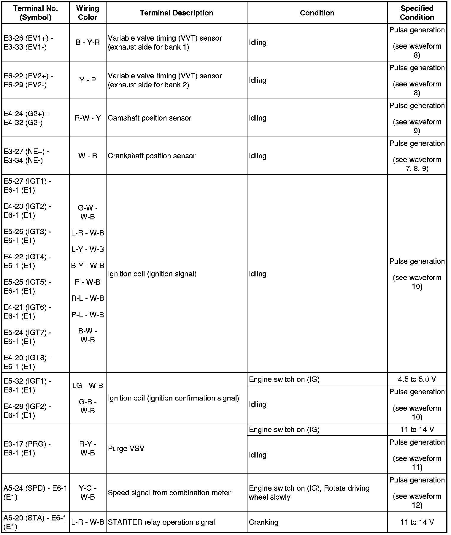 HINT: The standard normal voltage between each pair of the ECM terminals is shown in the table below. The appropriate conditions for checking each pair of the terminals are also indicated. The result of checks should be compared with the standard normal voltage for that pair of terminals, displayed in the Specified Condition column. The illustration above can be used as a reference to identify the ECM terminal locations.
