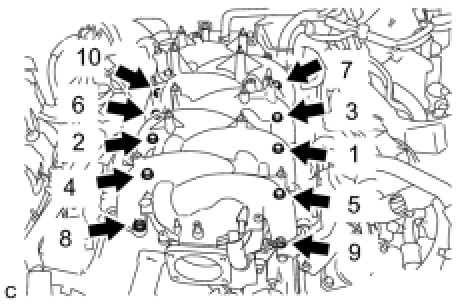 Temporarily install the intake air surge tank assembly with the 2 nuts and 8 bolts. Then tighten the 2 nuts and 8 bolts uniformly in the order shown in the illustration.