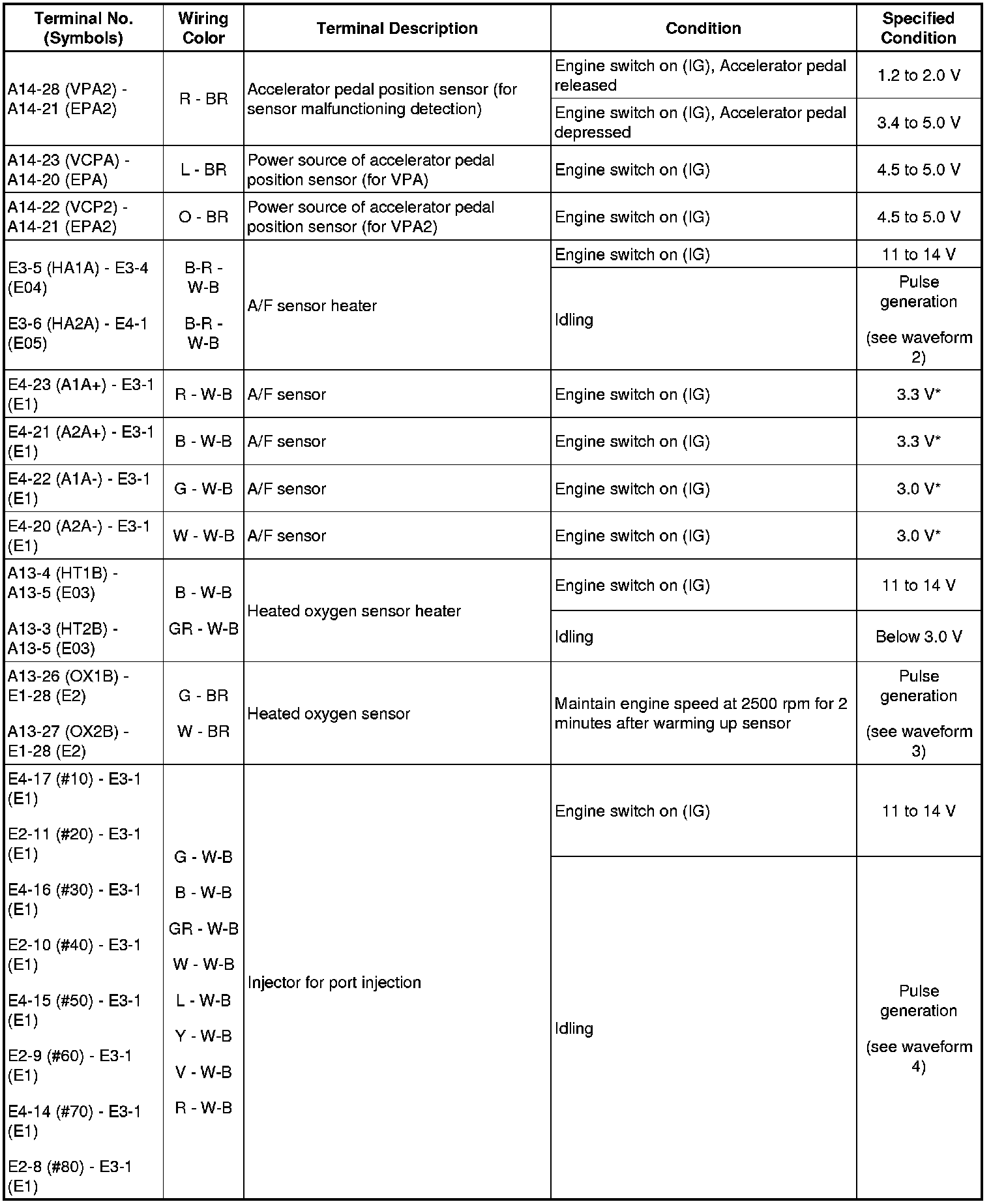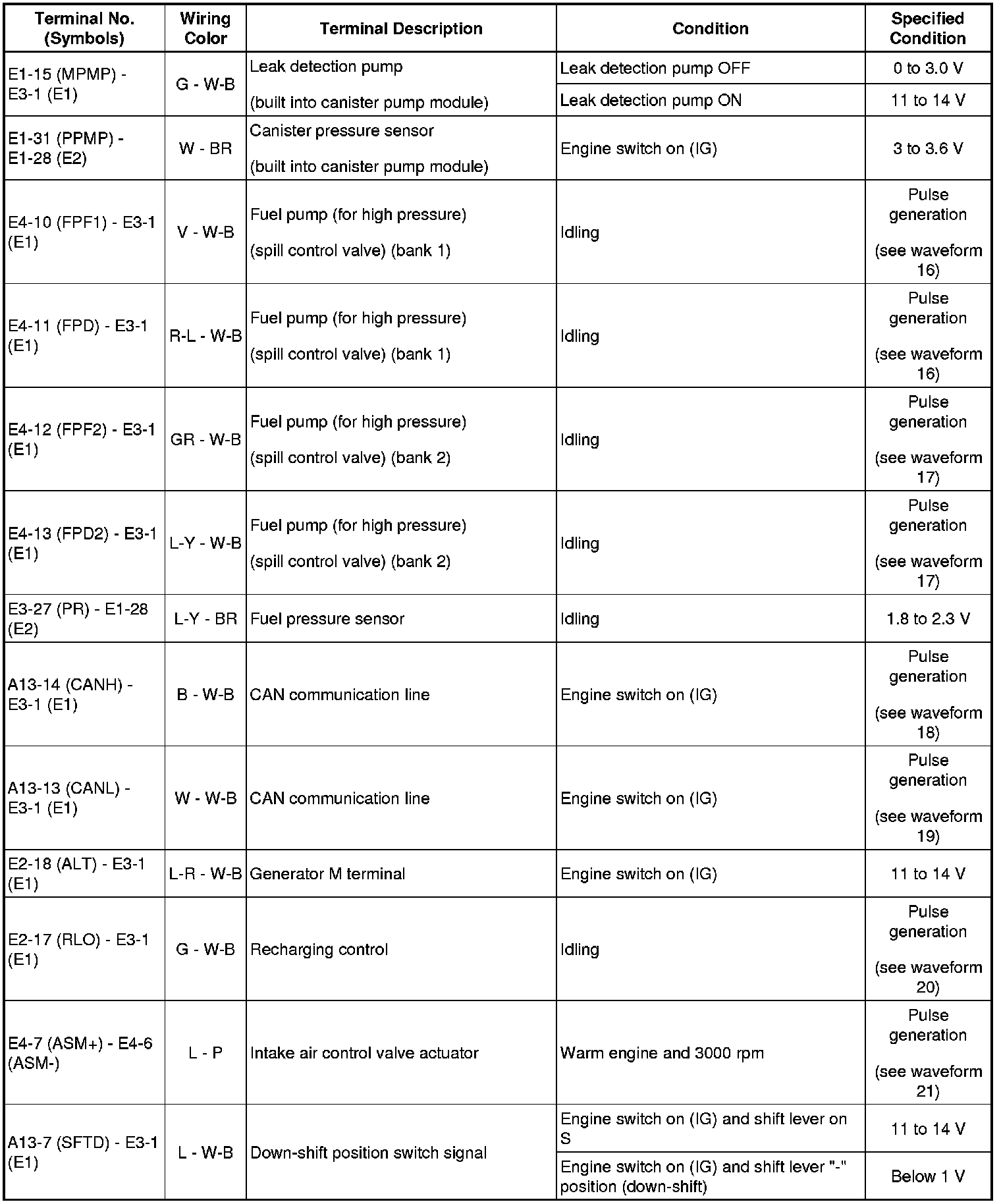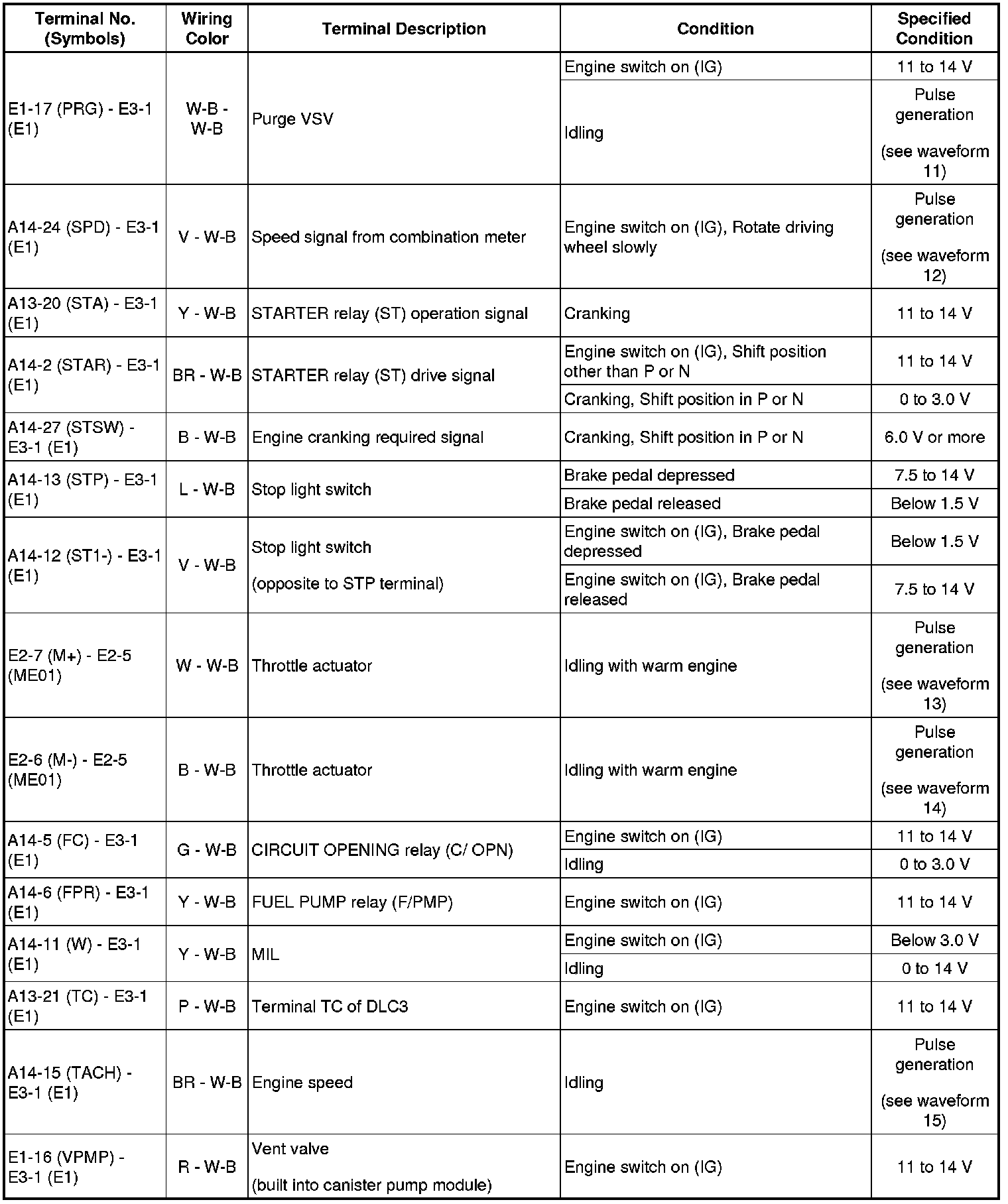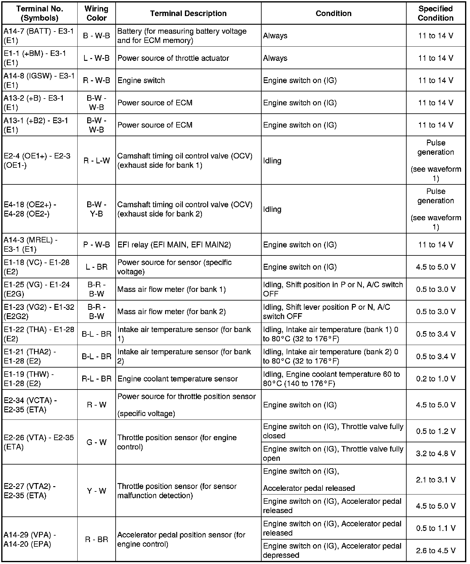 HINT: The standard normal voltage between each pair of the ECM terminals is shown in the table below. The appropriate conditions for checking each pair of the terminals are also indicated. The result of checks should be compared with the standard normal voltage for that pair of terminals, displayed in the Specified Condition column. The illustration above can be used as a reference to identify the ECM terminal locations.