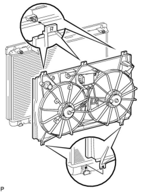 (a) Set the fan shroud with fan and motor to the radiator, and attach the 3 claws to install the fan shroud.