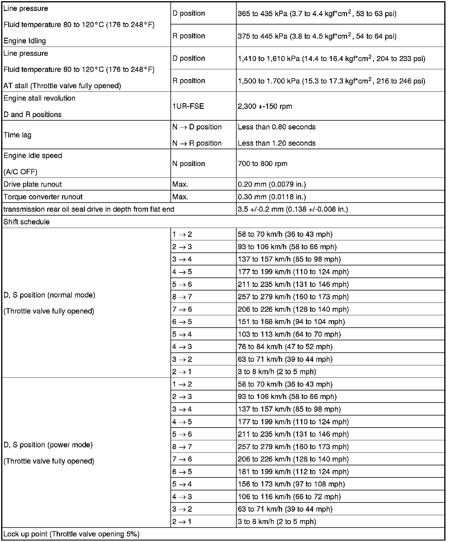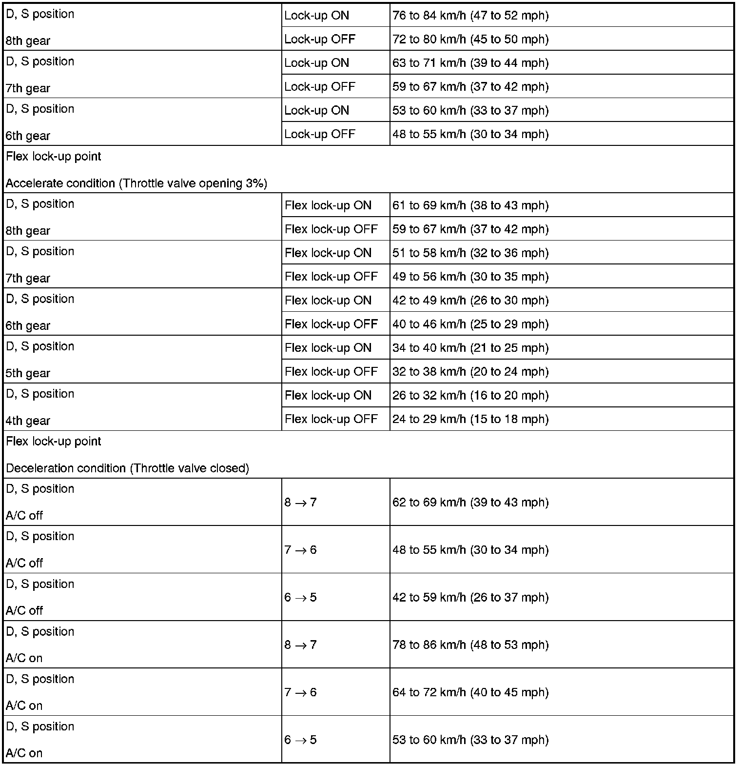 - All shift point values indicated in the above tables are actual values. Therefore, if checking a shift point with a chassis dynamometer, keep in mind that there is a range of error in the chassis dynamometer indication.