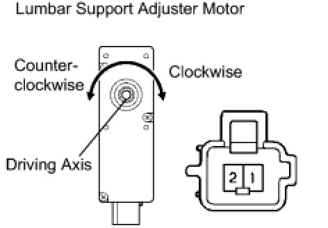 (1) Check the motor rotation when the battery is connected to the lumbar support adjuster motor connector terminals.