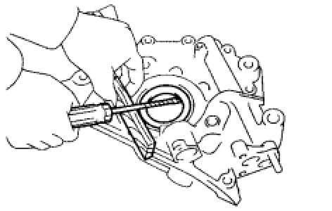 NOTE: To protect the oil pump body while prying out the seal, place a wooden block between the screwdriver and oil pump body.