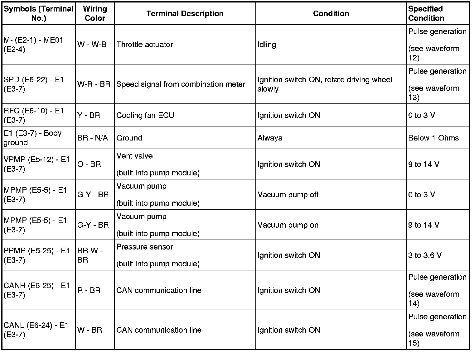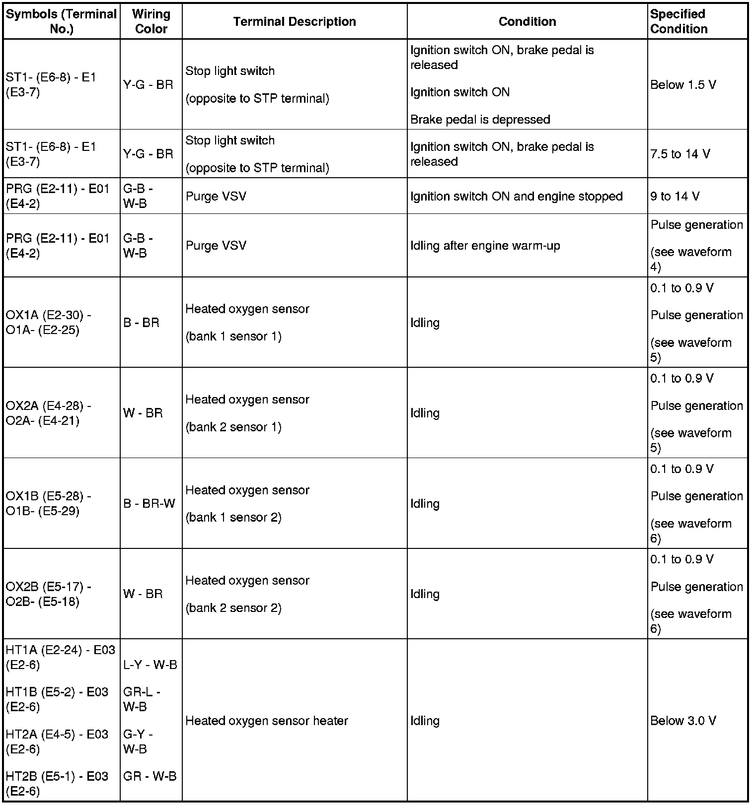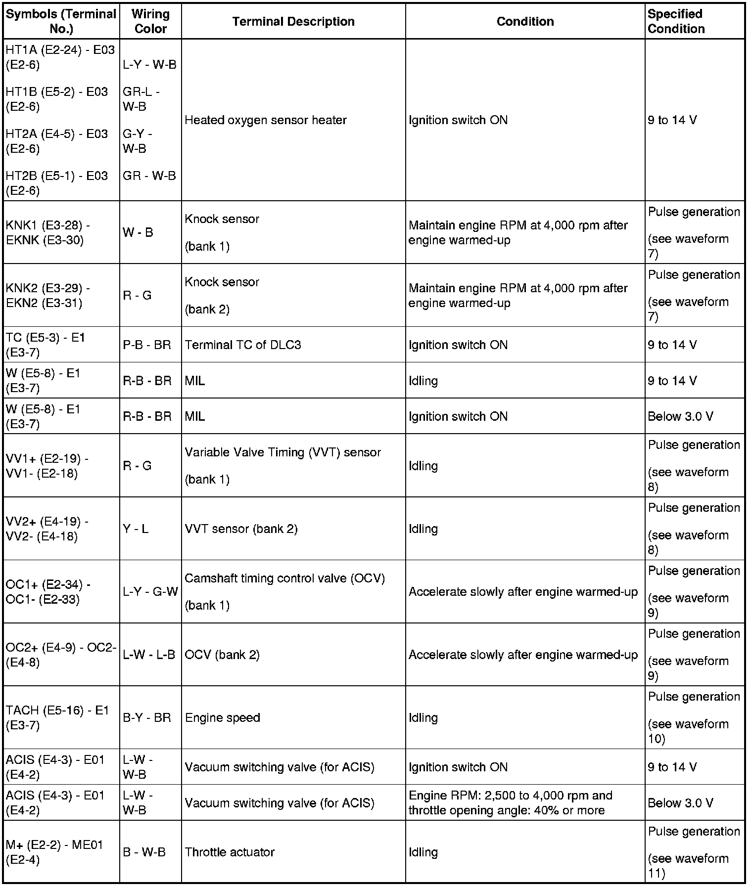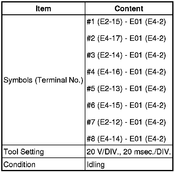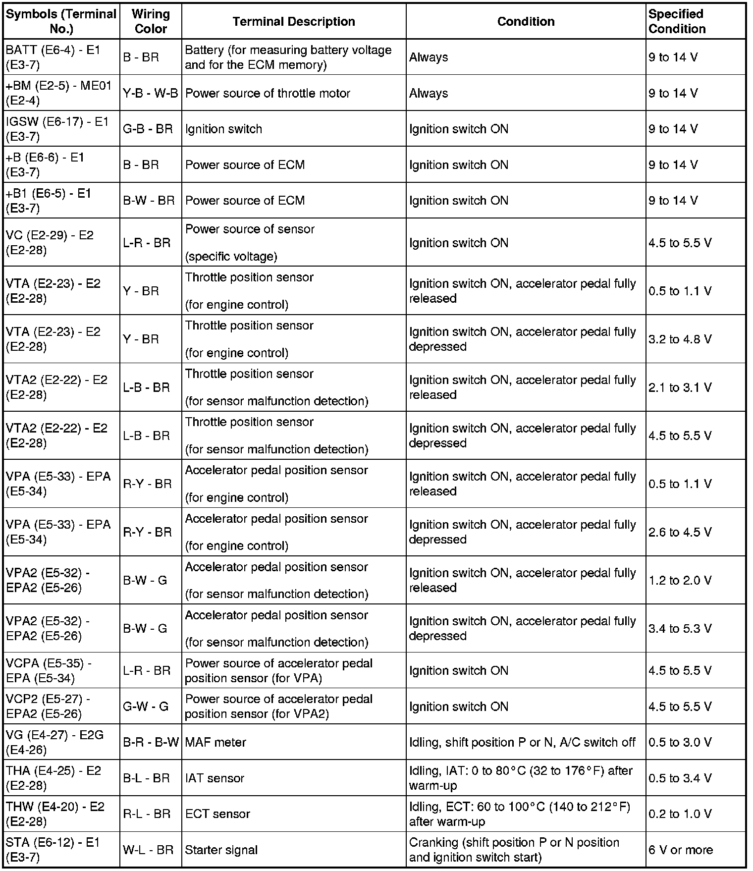 HINT: Each ECM terminal's standard voltage is shown in the table below. In the table, first follow the information under "Condition". Look under "Symbols (Terminal No.)" for the terminals to be inspected. The standard voltage between the terminals is shown under "Specified Condition".