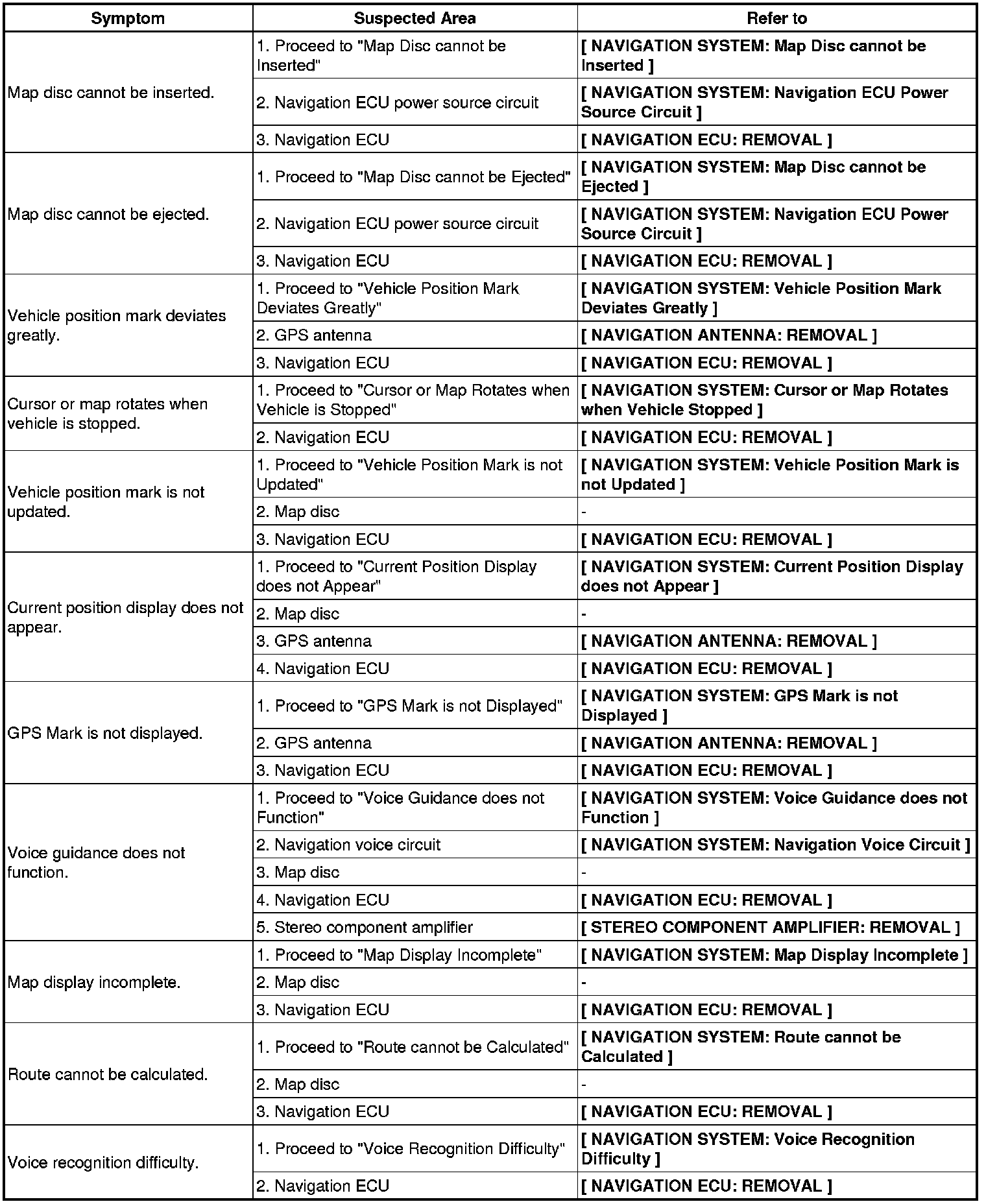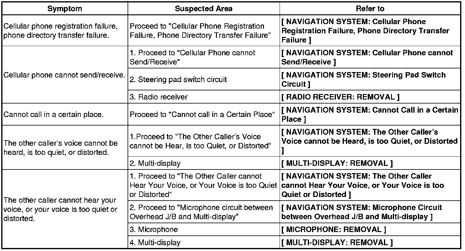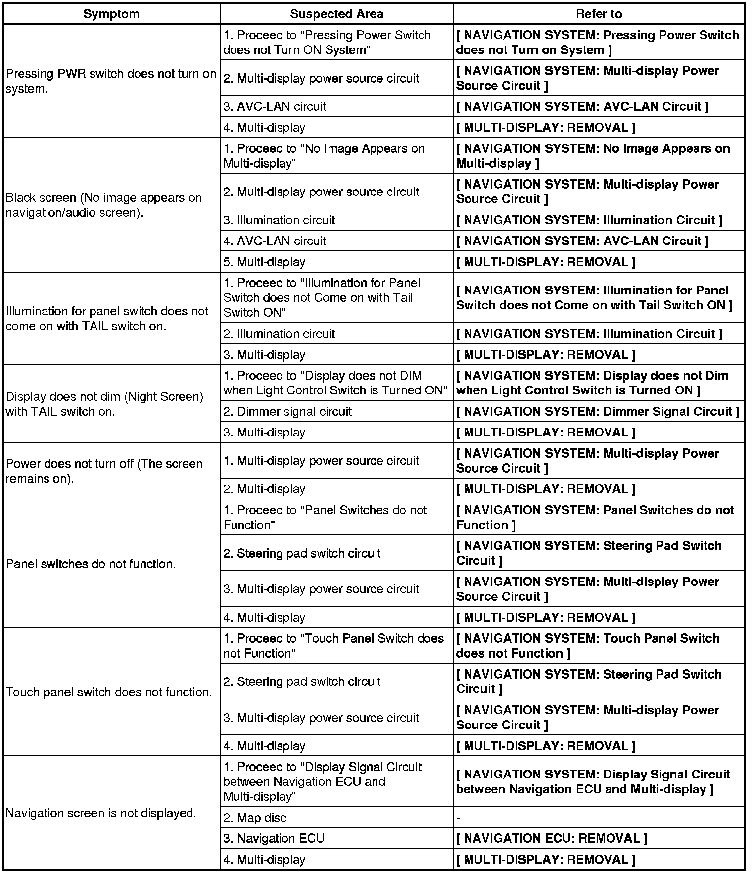 - Methods used to verify the cause of the problem are listed in order of probability in the suspected area column.