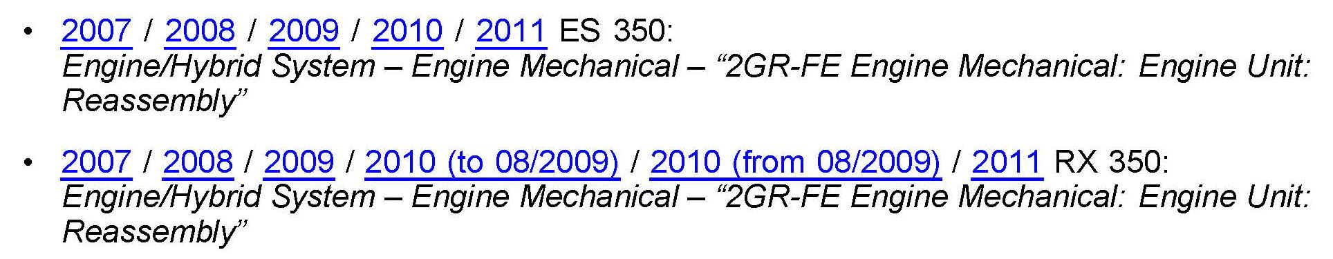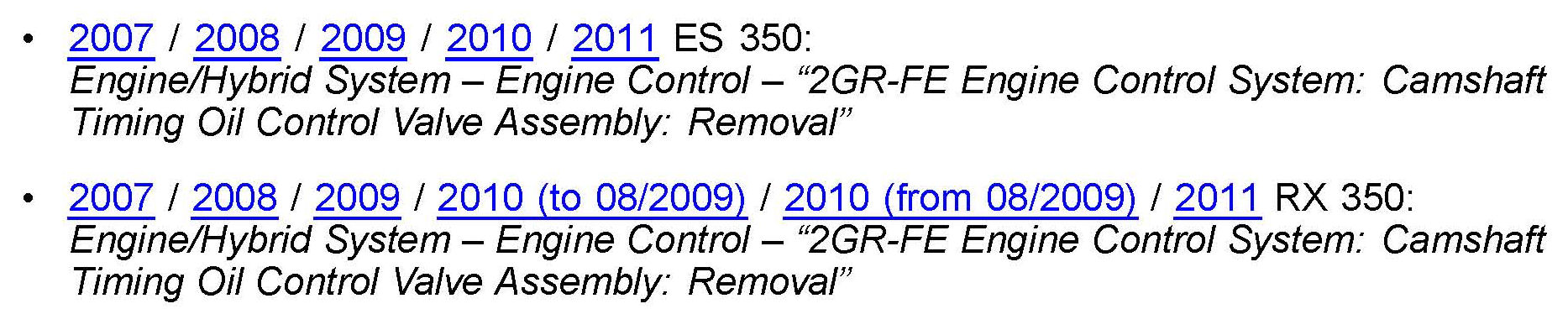 Some 2007 - 2011 model year ES 350 and RX 350 vehicles may exhibit a MIL "ON" condition with one or more VVT-i related Diagnostic Trouble Codes (DTCs) stored in the Engine Control Module or ECM (SAE term: Powertrain Control Module/PCM). Please use the following repair procedure to address this condition.