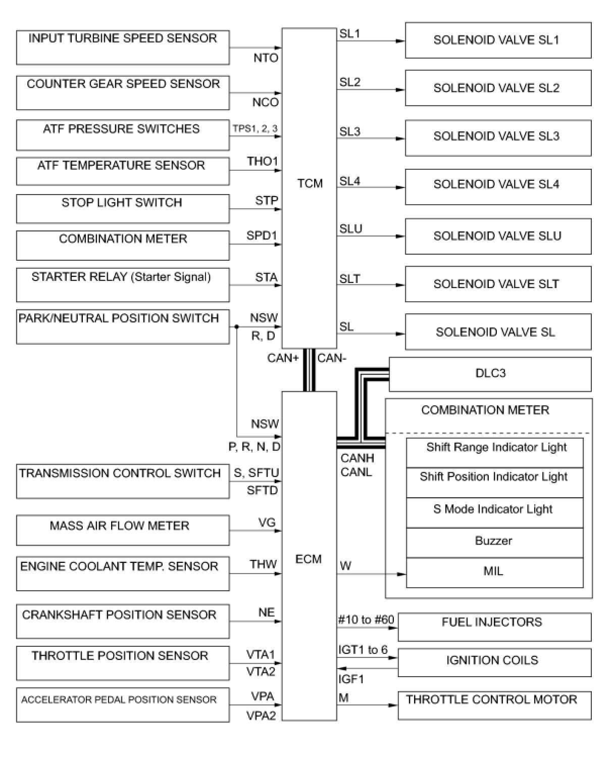 The configuration of the electronic control system in the U660E automatic transaxle is as shown in the following chart.