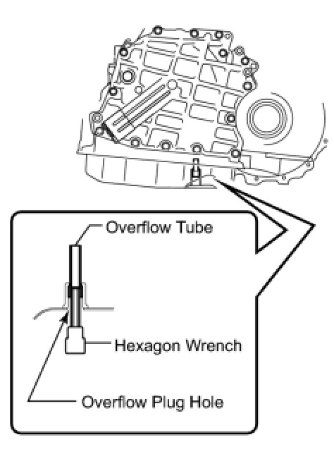 - If ATF comes out, it is not necessary to perform the initial filling procedure. After checking the tightening torque of the overflow tube, temporarily tighten the overflow plug.