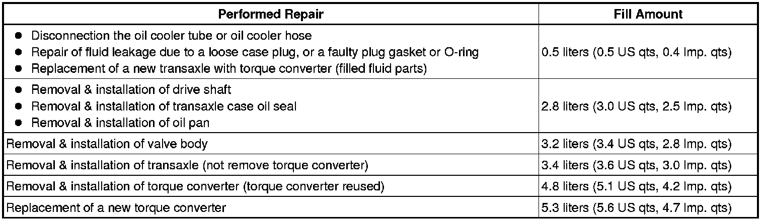 (a) Fill the transaxle with the correct amount of fluid as listed in the table below.