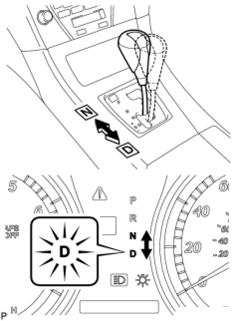 (5) While observing the D shift indicator on the combination meter, move the shift lever back and forth between N and D at an interval of 1.5 seconds for 6 seconds or more.