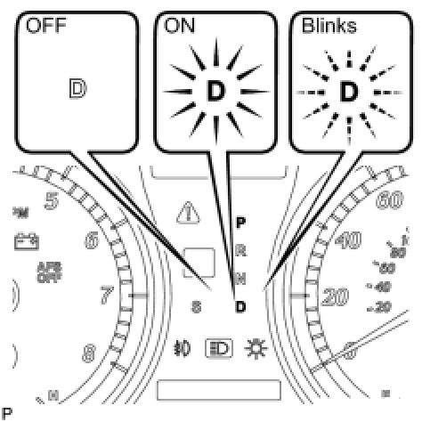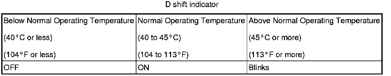 HINT: In the fluid temperature detection mode, the D shift indicator comes on, goes off, or blinks depending on the fluid temperature.