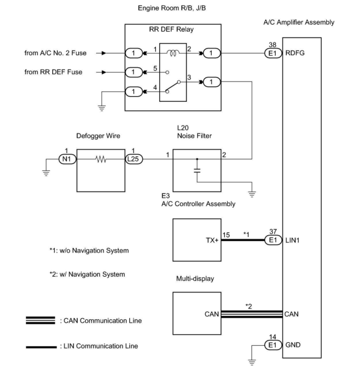 When the rear window defogger switch, which is built into the heater control assembly*1 or multi-display*2, is operated, the operation signals are transmitted to the A/C amplifier assembly through LIN*1 or CAN*2. When the A/C amplifier assembly receives the signals, it turns on the RR DEF relay to operate the rear window defogger.