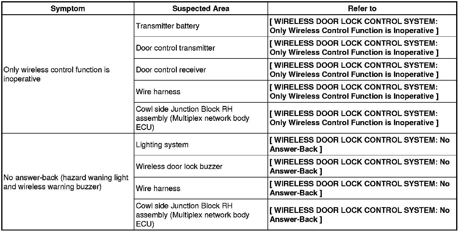 DOOR LOCK: WIRELESS DOOR LOCK CONTROL SYSTEM: PROBLEM SYMPTOMS TABLE