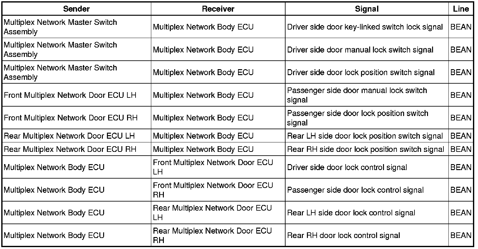 - The door control switch of the multiplex network master switch and the driver door key cylinder use the BEAN line to send lock / unlock request signals through the multiplex network master switch to the multiplex network body ECU.