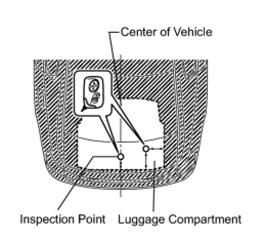 (2) Inspect the key lock-in prevention's detection area. Pay attention to the direction of the key shown in the illustration. When the key is in either of the 2 locations in the illustration, check that: 1) closing the luggage compartment door sounds the key's wireless buzzer, and 2) pressing the power luggage door open switch opens the luggage compartment door.