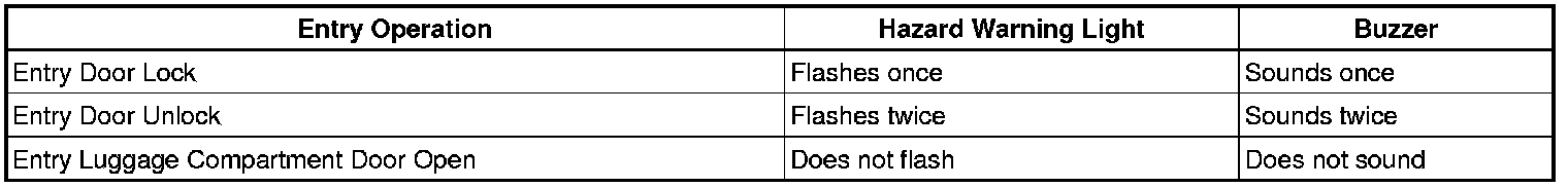 (1) Place the key in the luggage compartment with all doors locked. Check that: 1) closing the luggage compartment door triggers the key's wireless buzzer (which lasts approximately 2 seconds), and 2) pressing the power luggage door open switch opens the luggage compartment door.