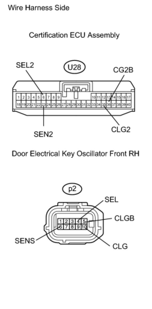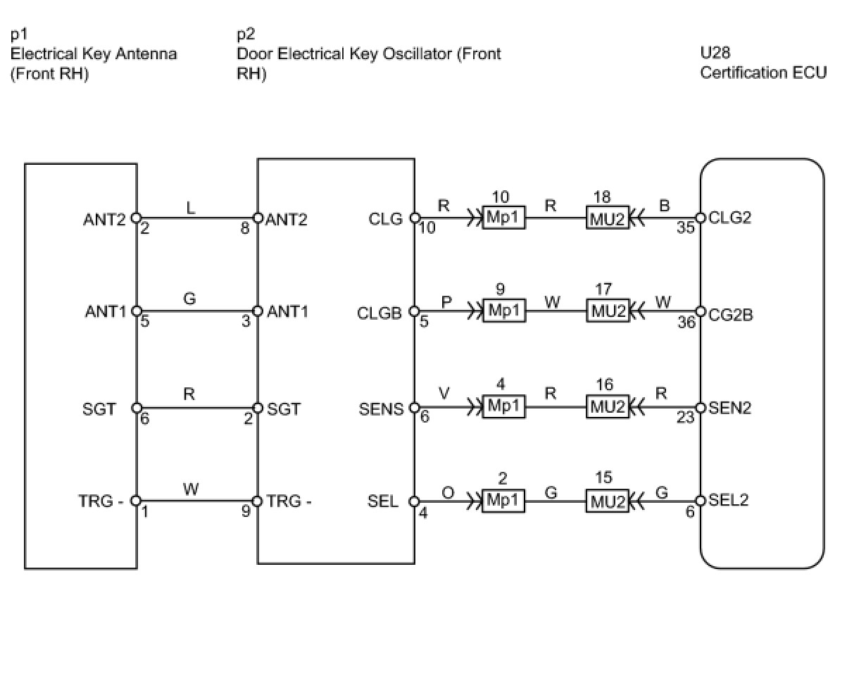 When an ID code from the door electrical key oscillator front RH matches an ID code from the key, the multiplex network door ECU front RH (front passenger door ECU) outputs a SEL signal (Lo when output) to the door electrical key oscillator front RH, activates the touch sensor inside the outside door handle, and enters unlock standby mode. When the touch sensor is touched, the door electrical key oscillator front RH sends a SENS signal (Lo when output) to the multiplex network door ECU front RH (front passenger door ECU) and the multiplex network door ECU front RH (front passenger door ECU) sends an unlock signal to the front passenger side door lock.