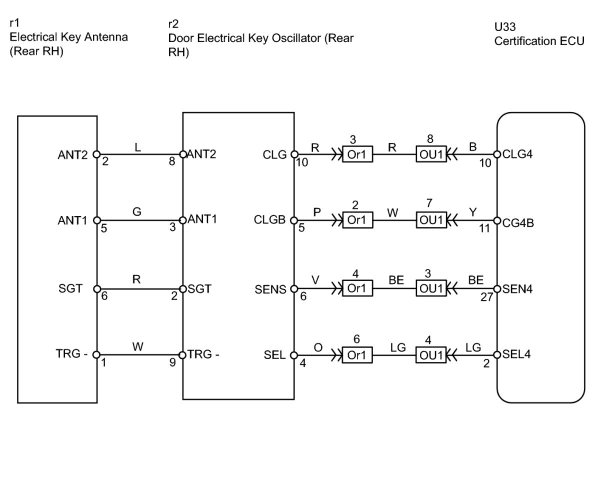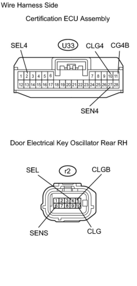 When an ID code from the door electrical key oscillator rear RH matches an ID code from the key, the multiplex network door ECU rear RH (rear door RH ECU) outputs a SEL signal (Lo when output) to the door electrical key oscillator rear RH, activates the touch sensor inside the outside door handle, and enters unlock standby mode. When the touch sensor is touched, the door electrical key oscillator rear RH sends a SENS signal (Lo when output)) to the multiplex network door ECU rear RH (rear door RH ECU) and the multiplex network door ECU rear RH (rear door RH ECU) sends an unlock signal to the rear door RH lock.