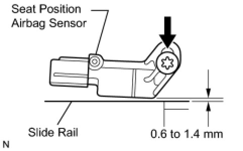 HINT: Make sure that the clearance between the seat position airbag sensor and the slide rail is within 0.6 to 1.4 mm (0.023 to 0.055 in.).
