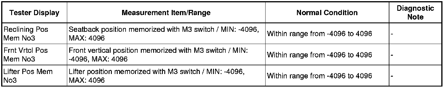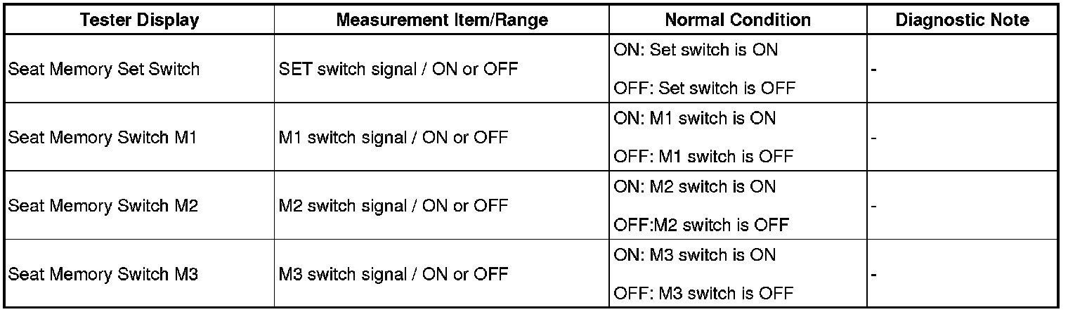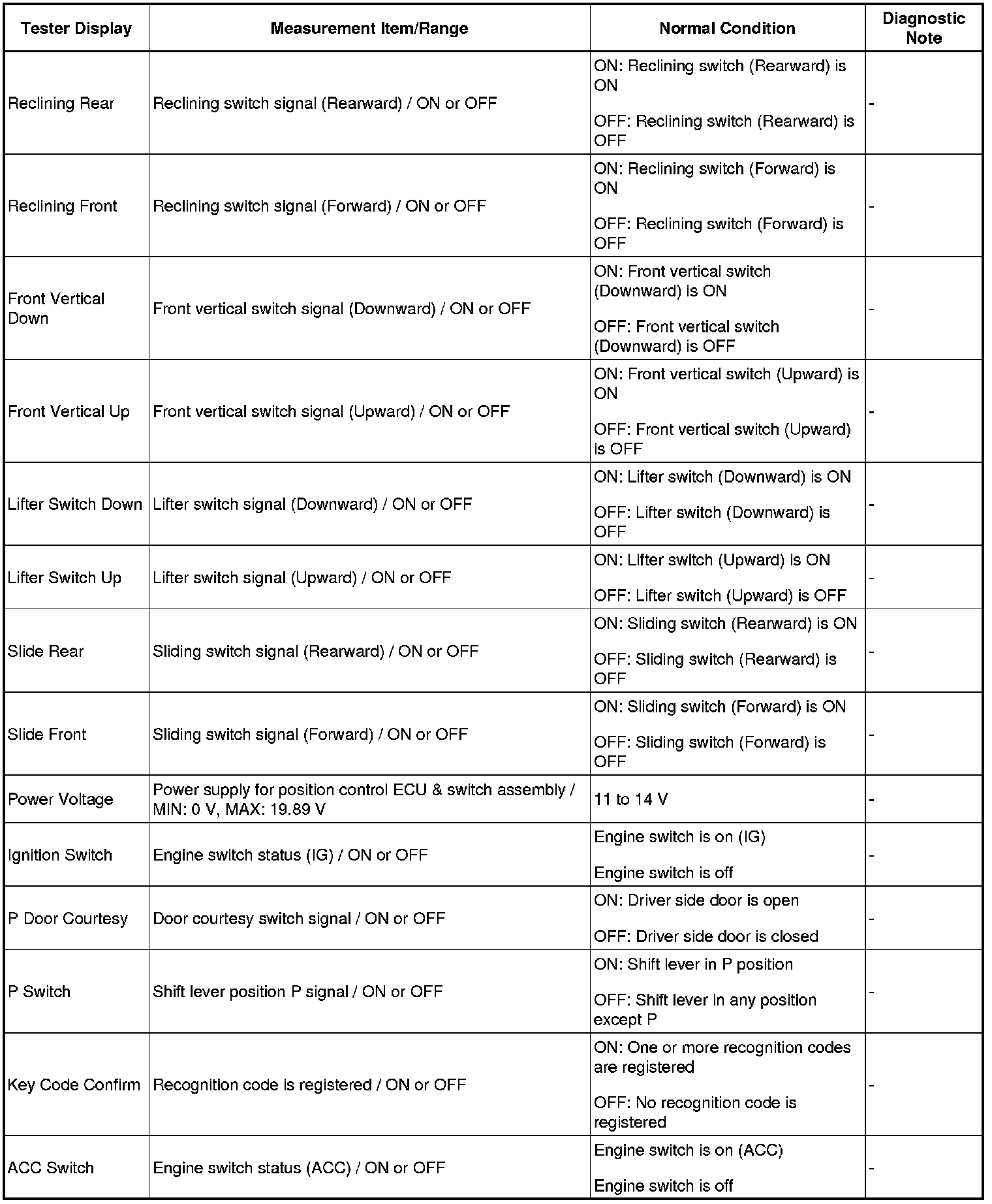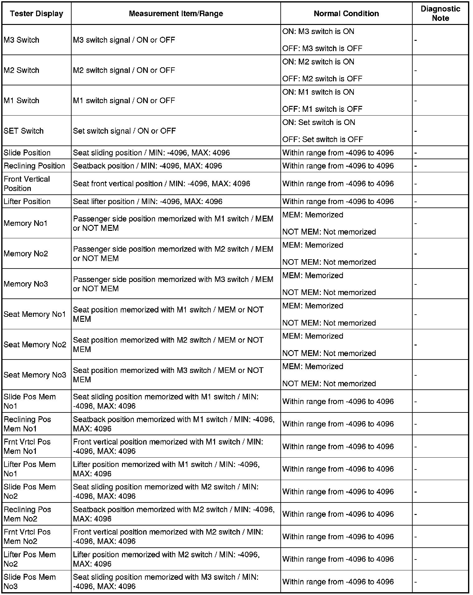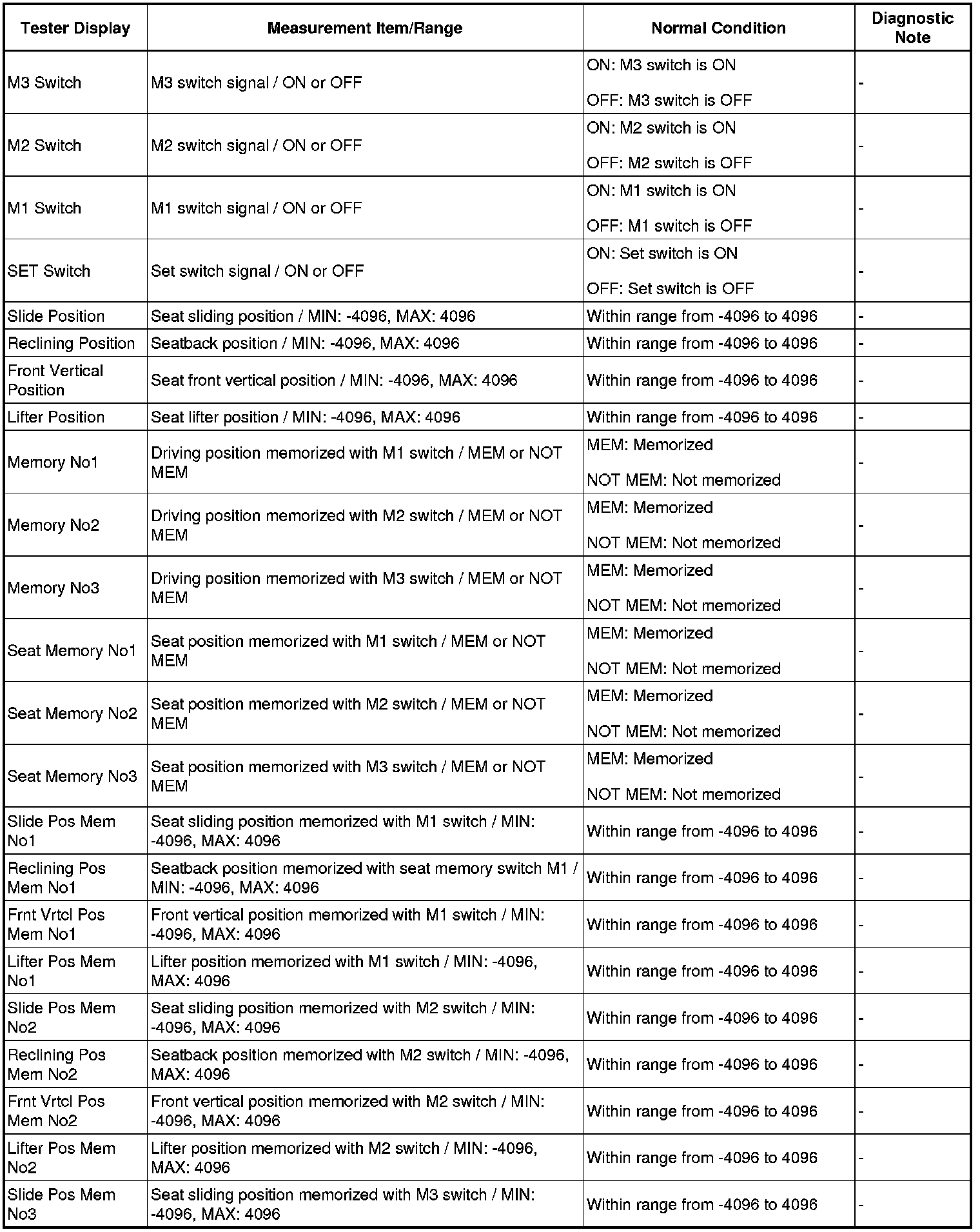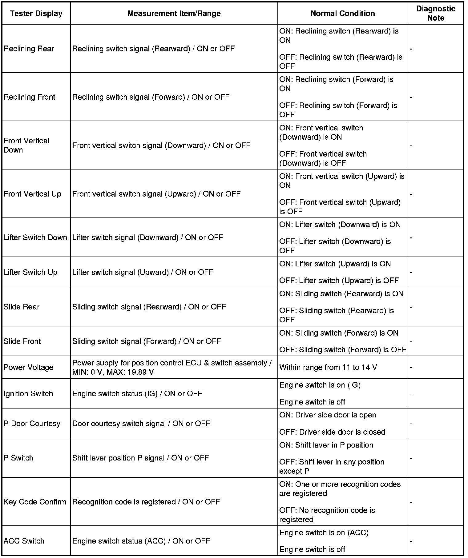 SEAT: FRONT POWER SEAT CONTROL SYSTEM (w/ Seat Position Memory System): DATA LIST / ACTIVE TEST