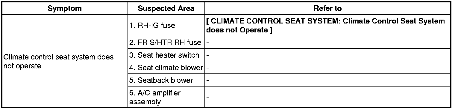SEAT: CLIMATE CONTROL SEAT SYSTEM: PROBLEM SYMPTOMS TABLE
