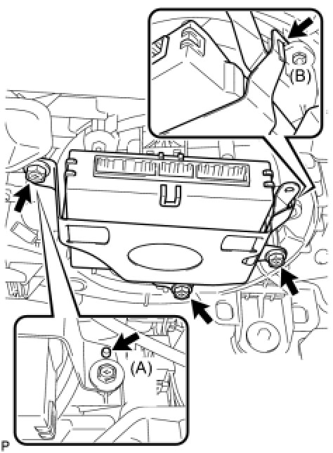 - Securely engage hook (B) of the skid control ECU with the blower assembly.