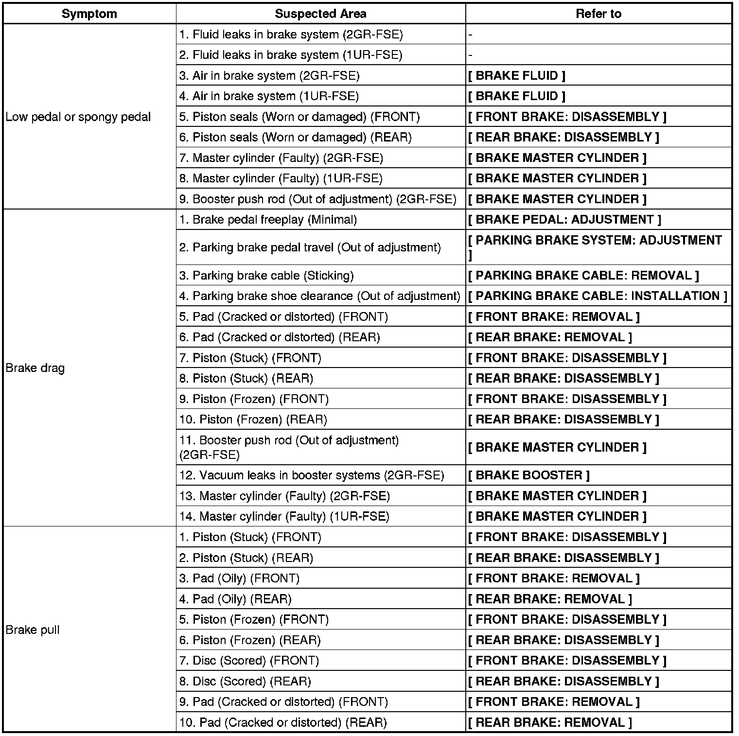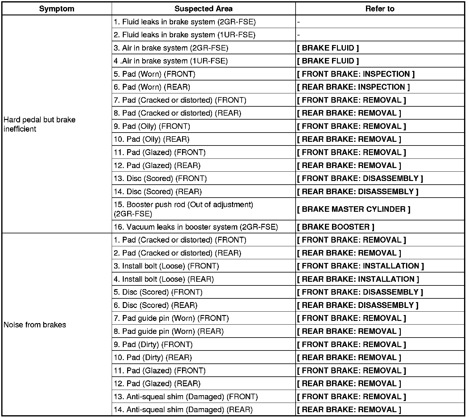 BRAKE: BRAKE SYSTEM: PROBLEM SYMPTOMS TABLE